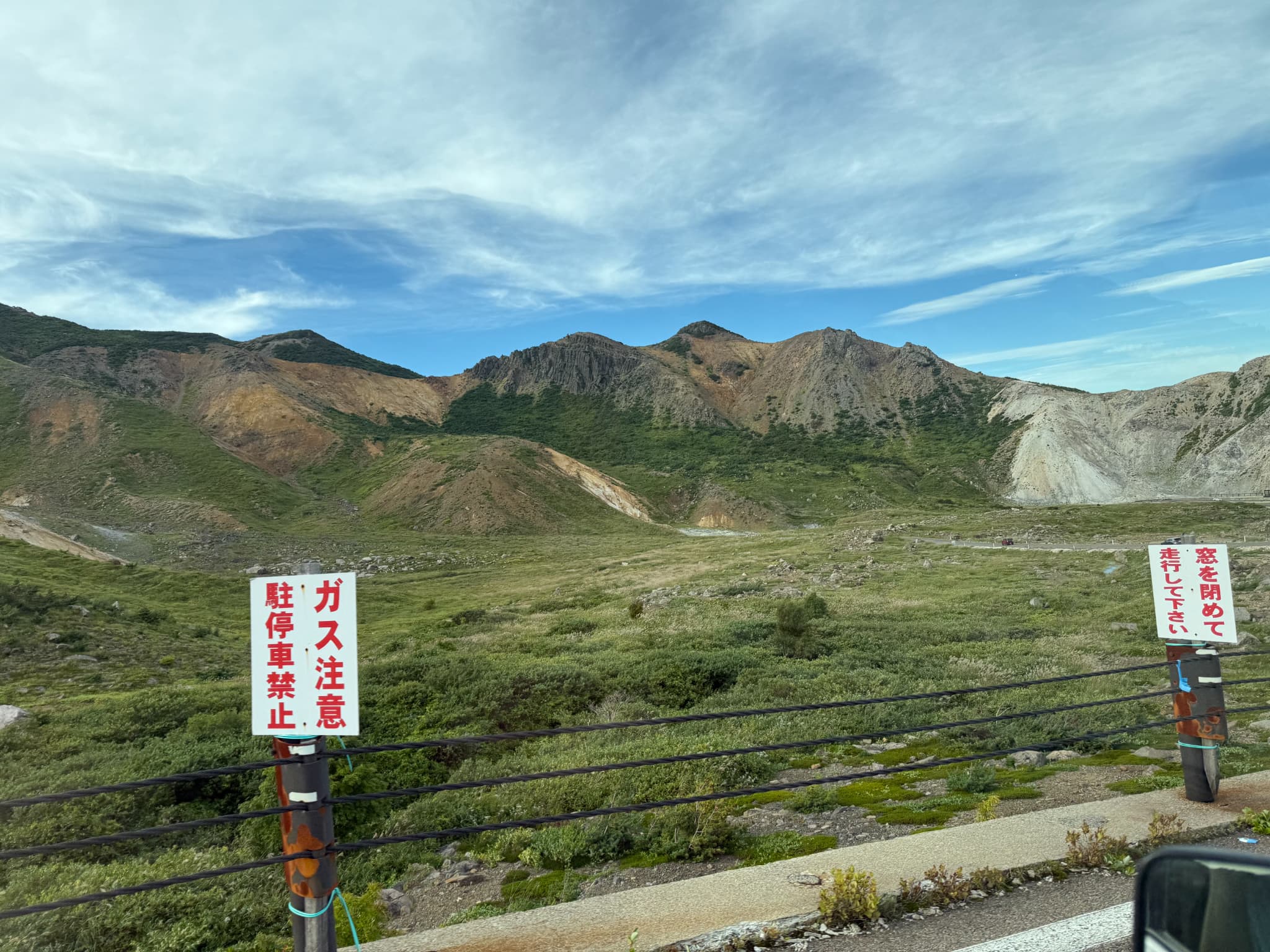 そのせいで、周辺は草木が生えていません。しかも自動車で走っていると、ガスで危ないから窓を閉めるようにとの警告文が・・・。